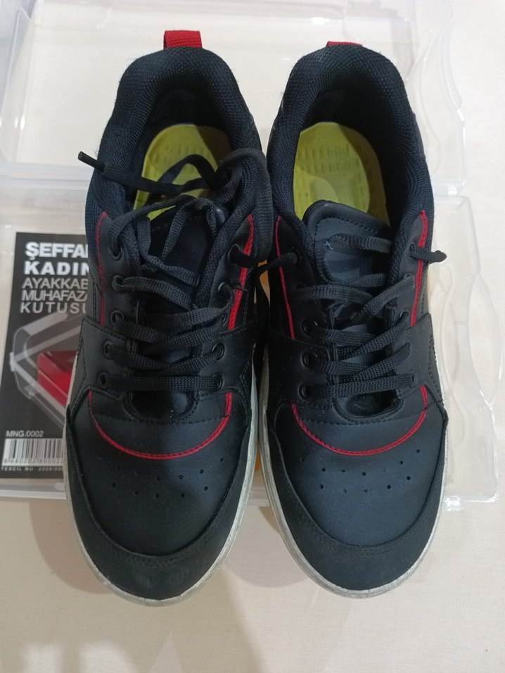 Siyah, renkli detaylı erkek çocuk spor ayakkabısı.38 numaradır