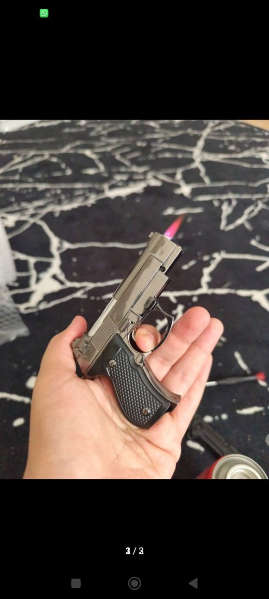 Gri gövde ve renkli detaylara sahip oyuncak tabanca, elde rahat tutuş sağlar ve gerçekçi görünüme sahiptir.