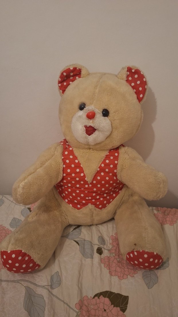 Yumuşak kahverengi peluş ayıcık, kulaklarında, yeleğinde ve ayaklarında renkli kırmızı puantiyeli detaylara sahip. Sevimli yüz ifadesiyle dikkat çeker.