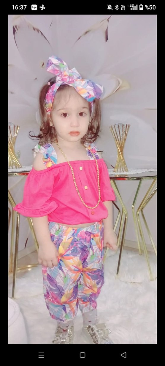 Renkli tie-dye desenli pantolon ve dantel detaylı pembe askılı üstten oluşan kız bebek takımı, uyumlu saç bandıyla tamamlanmıştır.