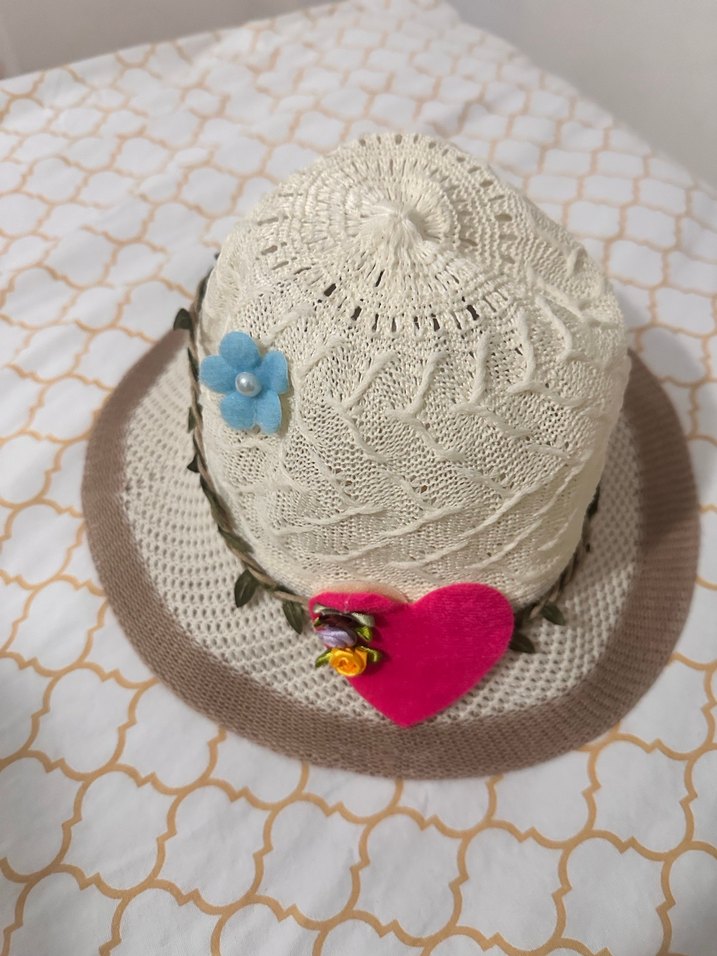 Ürünü severek almıştık ama kızım hiç kullanmadı 4-5 yas için uygun olduğunu düşünüyorum Beyaz renkli, örgü bohem kadın şapka, renkli mavi çiçek ve pembe kalp detaylarıyla retro hippie tarzını yansıtıyor.