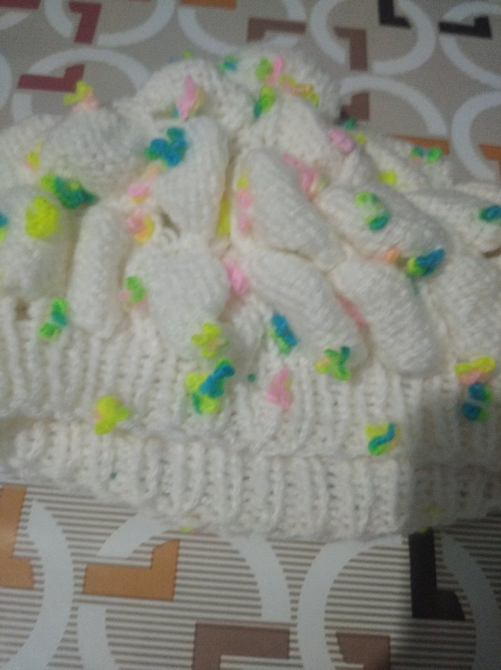 Renkli detaylara sahip beyaz örgü kadın bere, bohem ve rahat bir stil sunar. Bohem, hippie ve retro tarzlara uygundur. bebek örgü şapka