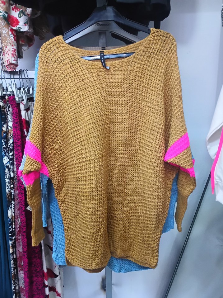 Örgü kumaştan, uzun kollu ve salaş kesim ı kazak, pembe ve mavi renk detaylarıyla günlük rahat kullanıma uygundur.