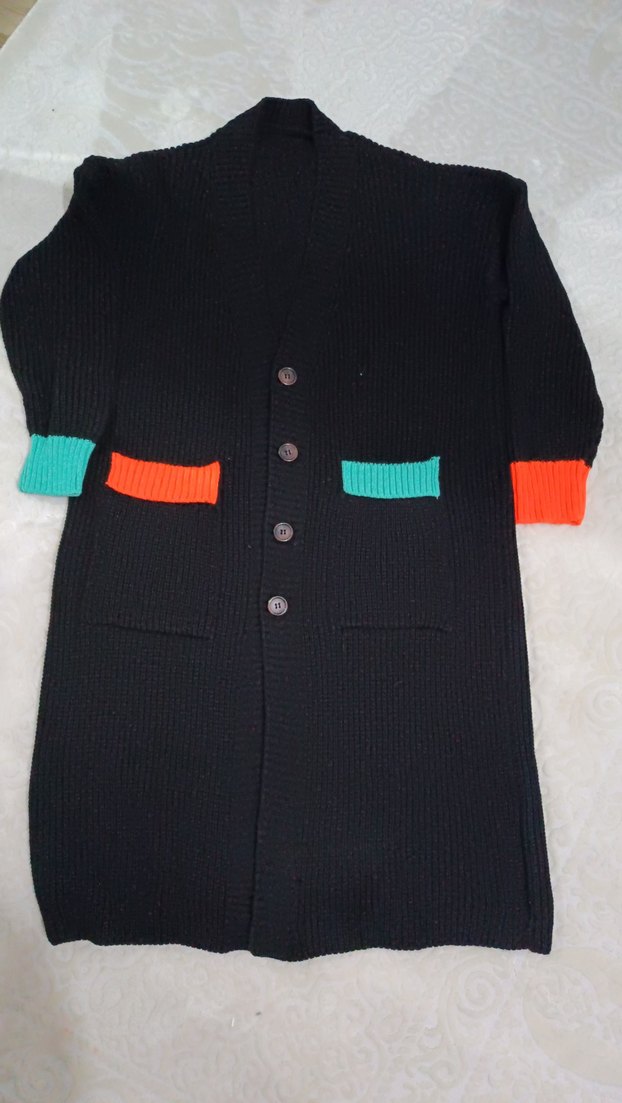 Uzun örgü kumaştan yapılmış, bol kesim, koyu renkli ve canlı turkuaz ile turuncu manşet ve ceplere sahip kadın hırkası.