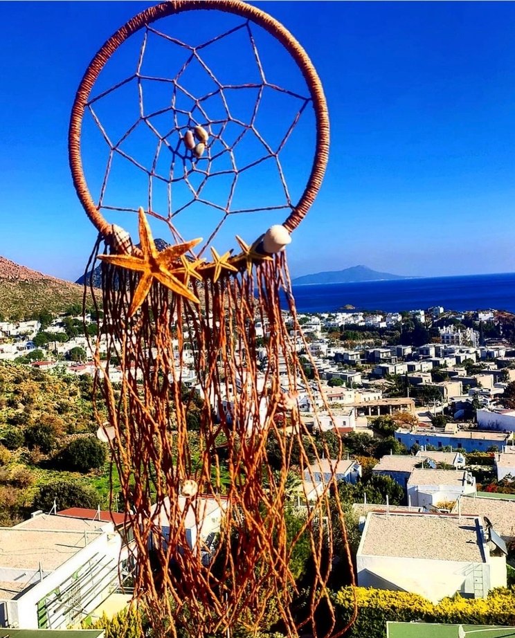 Deve tüyü renginde çerçeveye sahip, yıldız balıkları ve deniz kabuklarıyla süslenmiş renkli rüya yakalama süsü.