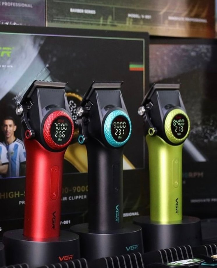 Dijital ekranlı, ayarlanabilir ayarları olan kırmızı, siyah ve yeşil renk seçenekli renkli saç kesme makinesi ✂️.