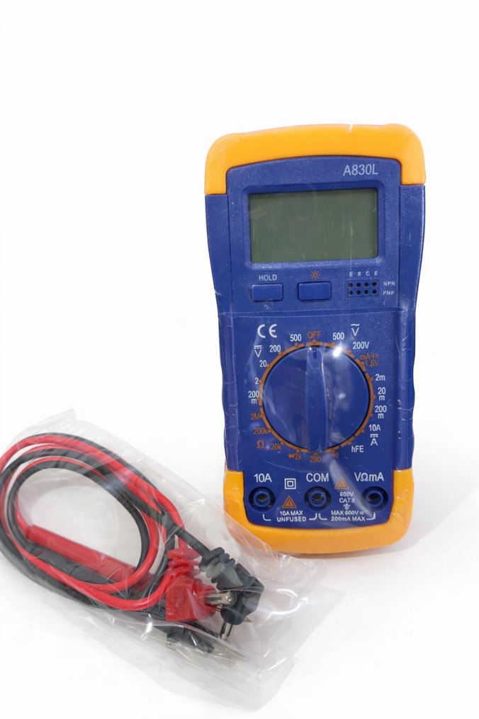Renkli A830L dijital multimetre, COM girişli ve ölçüm için test kablolarıyla birlikte gelir. Elektrik ölçümlerinde kullanılır.
