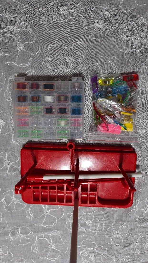 Çok renkli ipliklerin bulunduğu şeffaf kutu, çeşitli renkli dikiş klipsleri ve kırmızı plastik dikiş aksesuar kutusundan oluşan set. 25 li masura kutusu, 3 iplik tutucu ve 20 adet klips