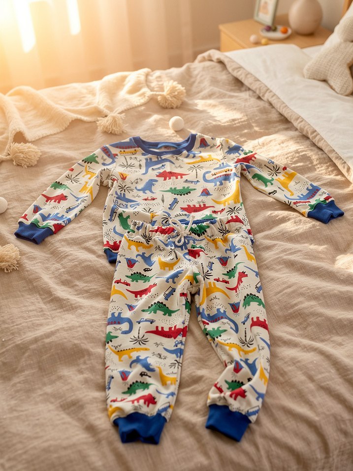 4/5 yaş çocuklar için Rahat kesim, uzun kollu ve bisiklet yaka erkek çocuk pijama takımı. Yumuşak örme kumaş üzerinde renkli dinazor desenleri bulunur. Manşet ve yaka mavi renktedir.