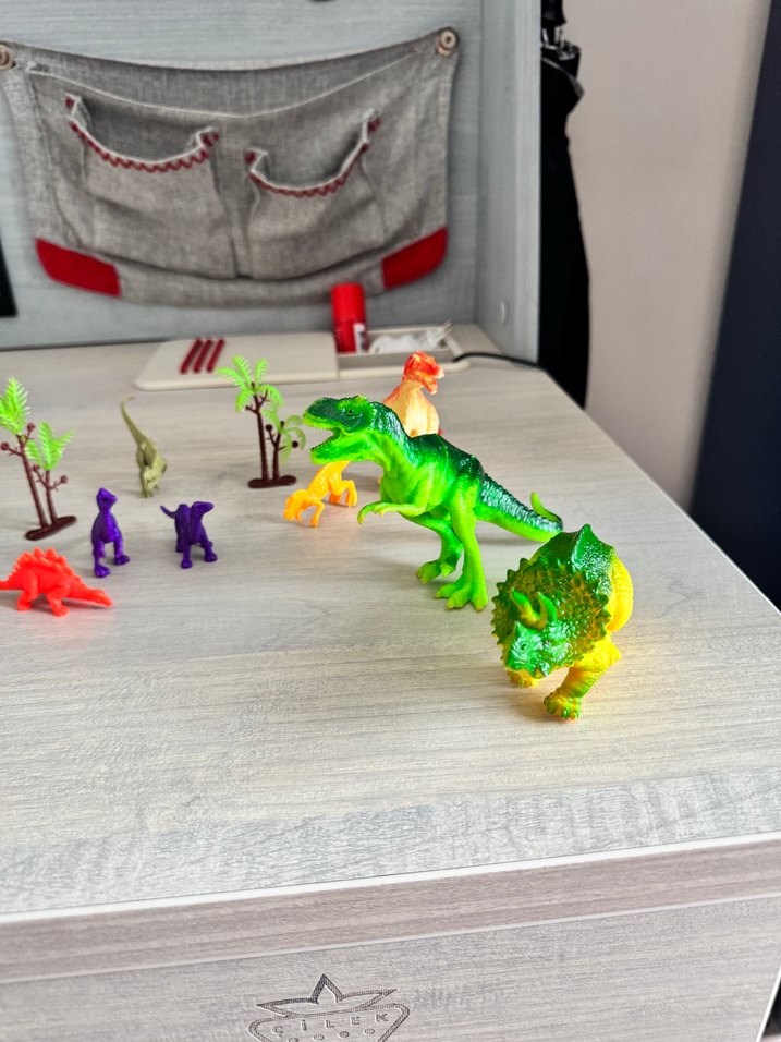 Çeşitli boy ve pozlarda, parlak yeşil ve renkli dinozor aksiyon figürleri seti. Hayal gücünü destekler.