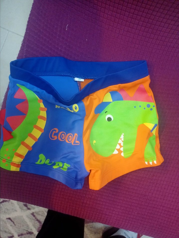 Renkli, dinozor baskılı, "COOL" yazılı erkek mayo. Kolsuz tasarımıyla yüzme için uygun. 4-5 yaş