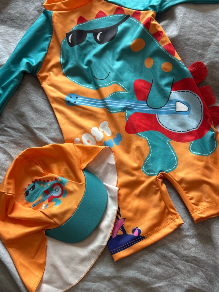 Kısa kollu, gitar çalan dinozor baskılı renkli erkek mayo takımı ve uyumlu güneş şapkası içerir.