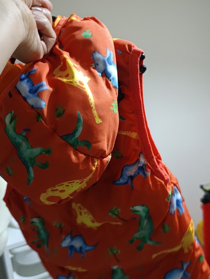 Renkli dinozor baskılı, kapüşonlu ve fermuarlı erkek yeleği, yumuşak sentetik kumaştan yapılmıştır. Sokak stili için uygun, dar kesimdir.