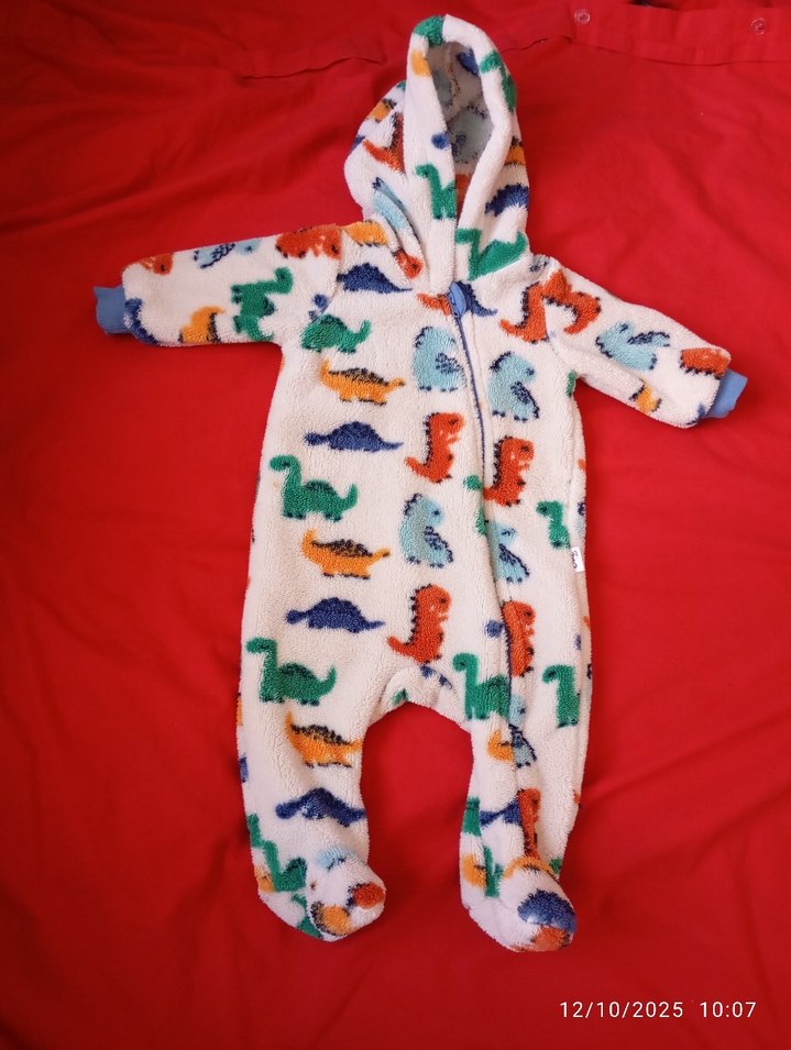Renkli dinozor desenli, fermuarlı, kapüşonlu ve ayaklı, yumuşak ve sıcak kumaştan yapılmış bebek tulumu. bebeğim Mart doğumlu bir iki ay doktor kontrollerinde mont olarak kullanıldı tertemiz sıfır ayarındadır