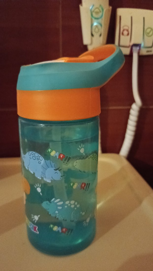 Mavi gövde üzerinde dinozor desenleri bulunan, turuncu ve mavi kapağı açılır çocuk matara.