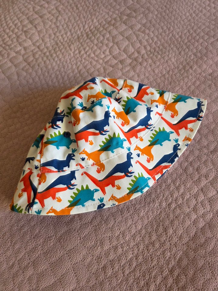 Sentetik kumaştan, fırfır detaylı, renkli dinozor desenli çocuk şapkası.