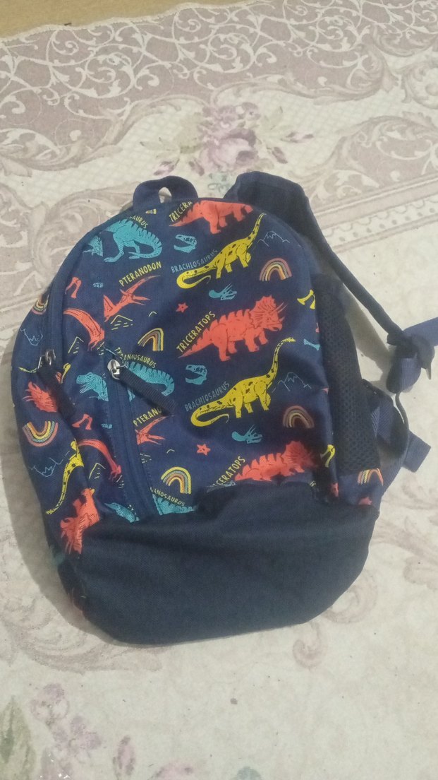 Canlı dinozor desenleriyle renkli çocuk sırt çantası, ayarlanabilir askılar ve kolay erişim için ön fermuarlı cep içerir.