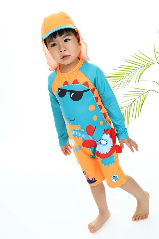 Uzun kollu, renkli dinozor desenli erkek çocuk mayo takımı ve güneş koruyucu şapka içerir . 2/3 3/4 4/5 5/6 7/8 9/10 yaş seçenekleriyle.