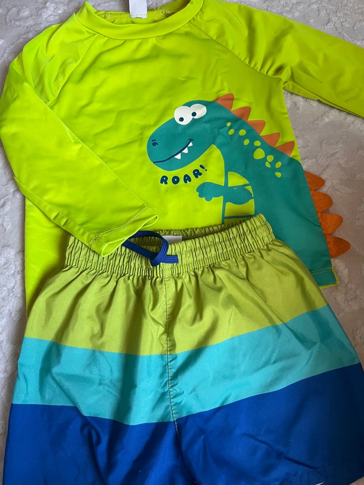 Uzun kollu, renkli dinozor desenli erkek çocuk mayo takımı, 'ROA' yazılı ve çizgili şortlu. #lcw #zara #çocukmayo #mayo