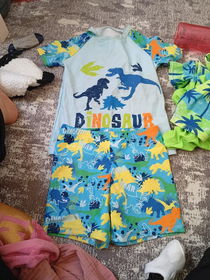 Kısa kollu, renkli dinozor desenli erkek mayo takımı, açık mavi üst ve uyumlu şortlardan oluşur.