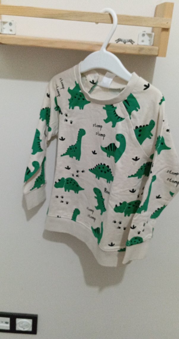 Rahat kesim, uzun kollu ve bisiklet yaka erkek sweatshirtü. Örgü kumaştan, renkli dinozor desenleriyle süslenmiş, günlük sokak stili için uygun.