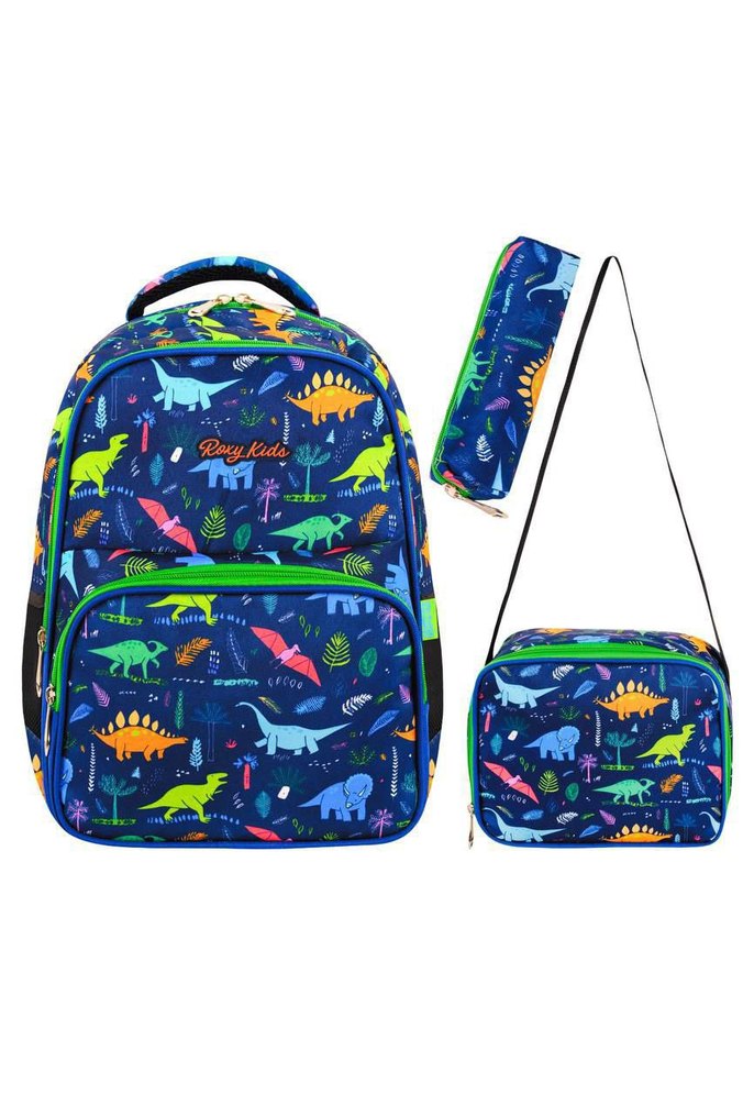 Renkli dinozor desenli çocuk ilkokul çantası seti; sırt çantası, kalemlik ve beslenme çantası içerir. Termal Beslenmeli ✨ 3’lü Set #çanta #çocukçanta #ilkokulçantası #çocukokulçantası #beslenmeçantası #kalemlik #okulmalzemeleri #kırtasiye