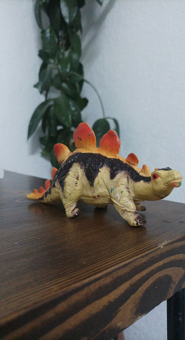 Renkli detaylara ve parlak turuncu vurgulara sahip deve rengi dinozor figürü.