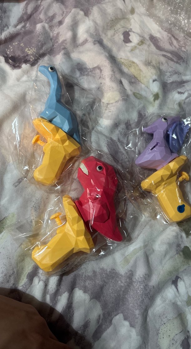 Pürüzsüz plastikten yapılmış, renkli dinozor şekilli su tabancaları. Her biri sarı saplı ve farklı renklerde dinozor başına sahip. İlan tek ürün fiyatıdır