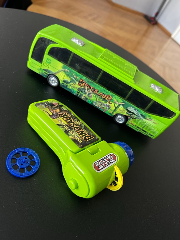 Dinozor temalı çıkartmalarla süslenmiş renkli yeşil oyuncak otobüs. Mavi ve sarı iki film şeridi bulunan dinozor sinematik. Duvara film şeridi yansıtılıyor pilli