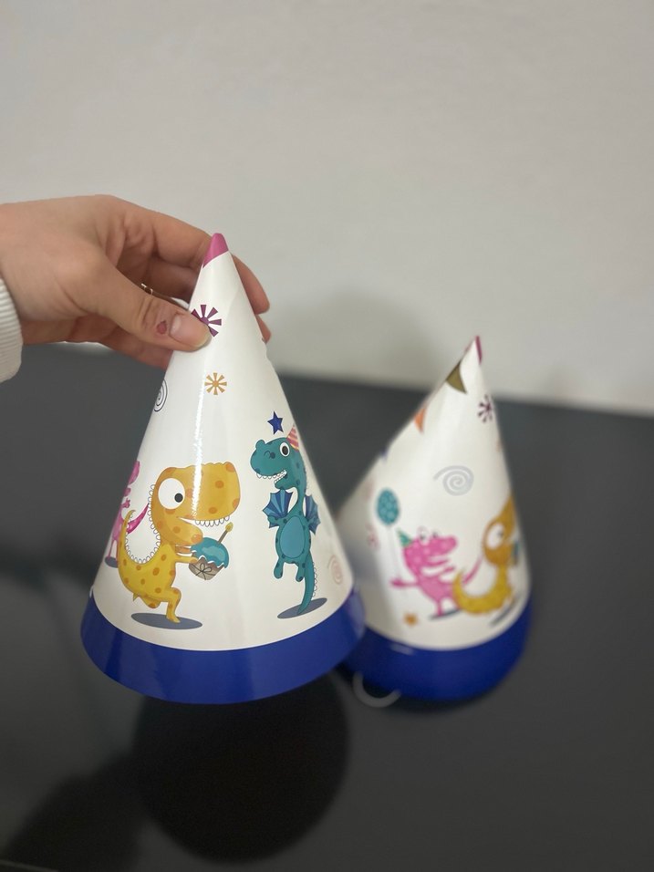 Renkli dinozor çizimleri ve mavi tabanı olan parti şapkaları, kutlamalar için uygundur. 7 adettir