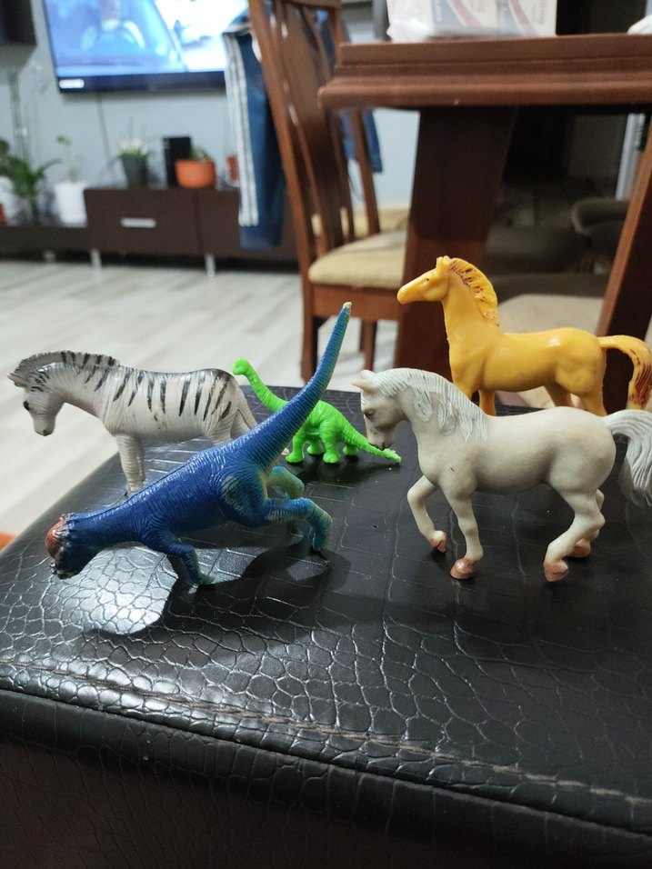 Dinozor ve at figürlerinden oluşan renkli bir set, detaylı tasarımlara sahip.