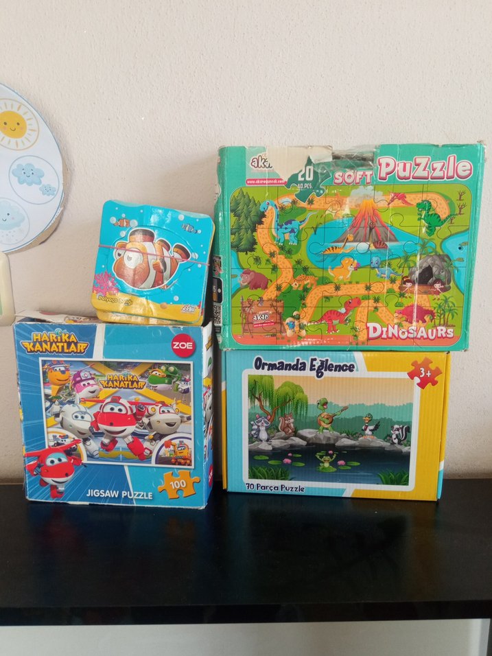 Dinozor ve orman temalı, farklı parça sayılarında renkli çocuk puzzle'ları. 20 parçalı yumuşak dinozor puzzle'ı ve 70 ile 100 parçalık diğer setler.