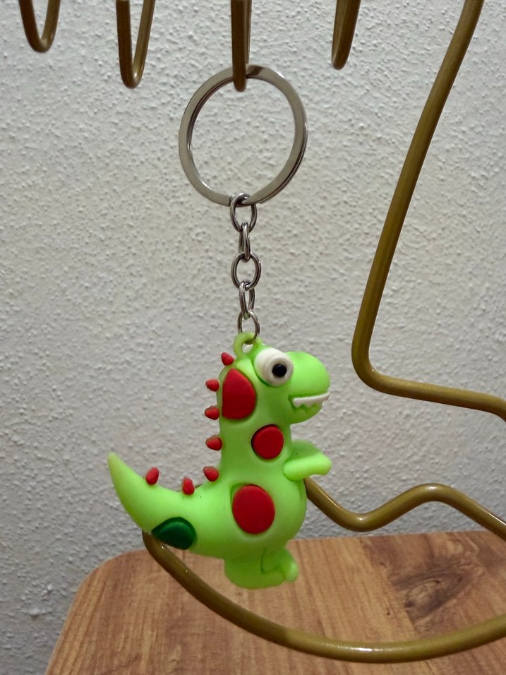 Renkli yeşil anahtarlık, zincir detaylı ve rock punk tarzında oyuncu dinozor figürlü.
