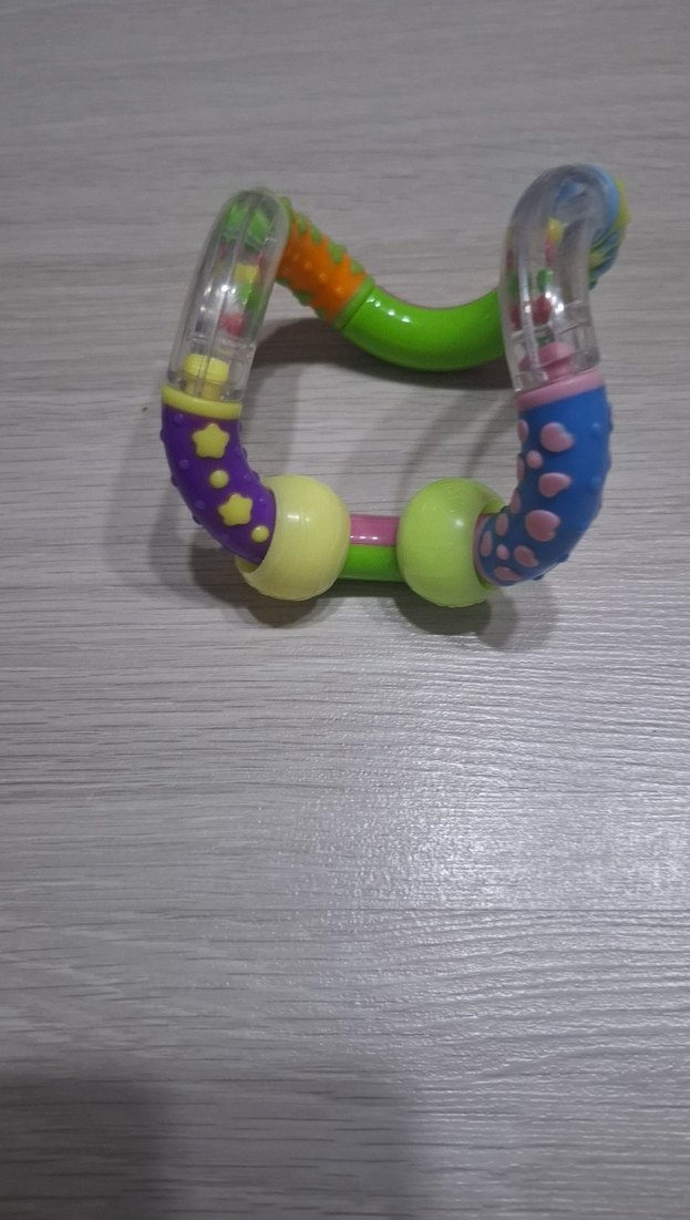 Çok renkli, farklı dokulara sahip diş kaşıyıcı ve çıngırak. Yumuşak ve dokulu tutma yerleri bebeklerin diş etlerini rahatlatır ve kolay kavranır.