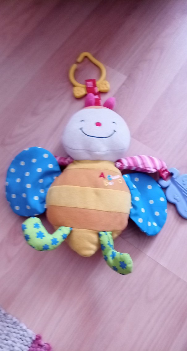 Yumuşak kumaş kanatlara ve kolay takma için klipsi olan gülümseyen kelebek şeklinde renkli diş kaşıyıcı ve çıngırak oyuncak.