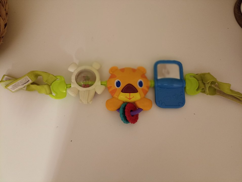 Renkli ve çeşitli şekillerde, diş kaşıma ve duyusal oyun için tasarlanmış çıngırak oyuncak. Ayrıca bebek arabasınin ön korumalığına takılabilir.