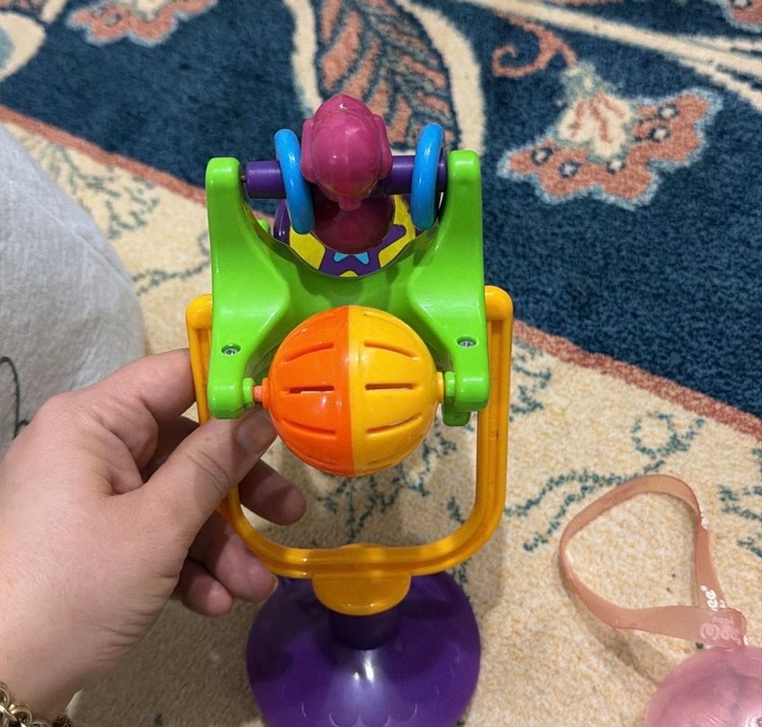 Emekleme ve diş çıkarma dönemine uygun, renkli halkalar ve dönen top içeren, vantuzlu diş kaşıyıcı ve çıngırak oyuncağı. Mama masası
