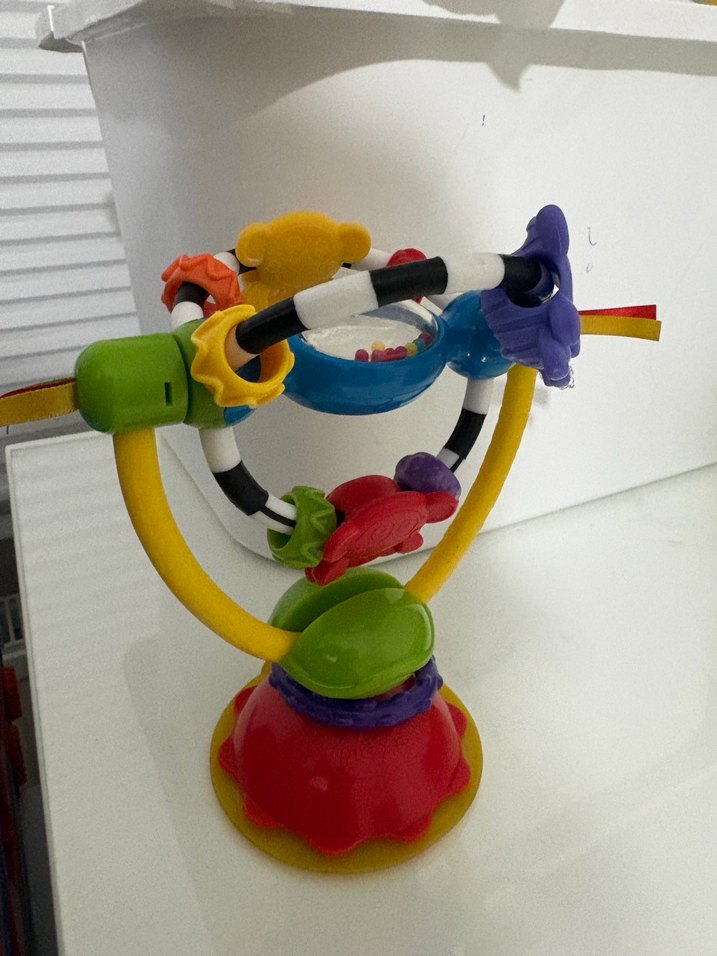 Çok renkli diş kaşıyıcı ve çıngırak, çeşitli dokulu parçalar ve sağlam taban içerir. Mama sandalye oyuncağı