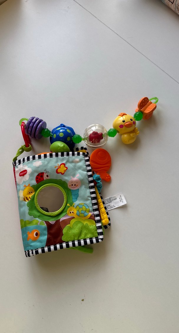 Farklı dokulara, ayna ve hayvan figürlerine sahip renkli diş kaşıyıcı ve çıngırak oyuncak, bebeklerin duyularını geliştirir.