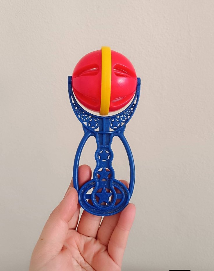 Mavi saplı, kırmızı-sarı topa sahip renkli diş kaşıyıcı ve çıngırak oyuncak, bebeklerin çiğnemesi ve oynaması için tasarlanmıştır.