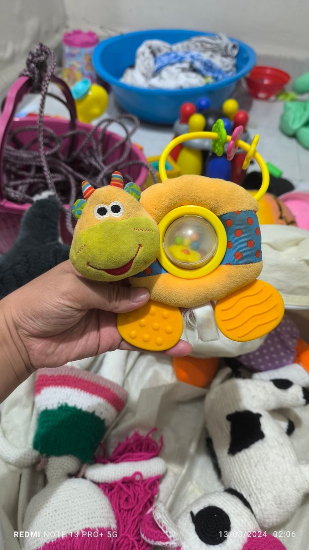Yumuşak, peluş ve dokulu yüzeyleri olan renkli diş kaşıyıcı ve çıngırak oyuncak, içinde küçük çıngırak bulunur. Çok renkli ve duyusal oyun için uygun.