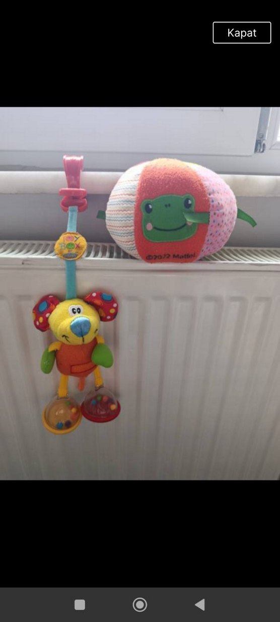 Kurbağa desenli yumuşak top ve sallanan köpek şeklinde çıngırak içeren renkli diş kaşıyıcı ve oyuncak seti.