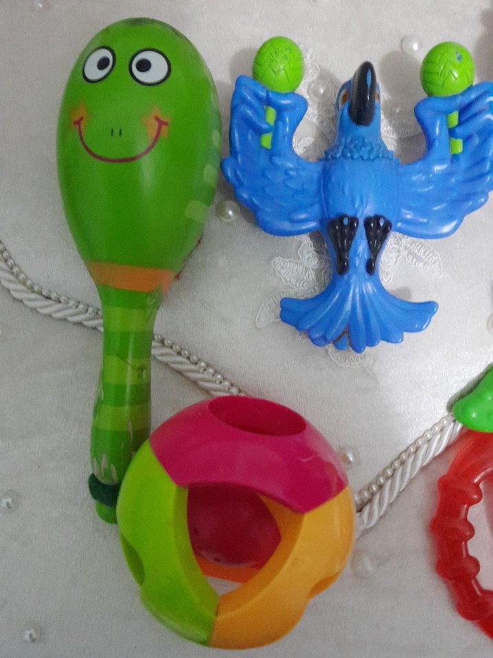 Renkli diş kaşıyıcı ve çıngırak seti, yeşil gülen maraka, mavi kuş şeklinde çıngırak ve çok renkli top içerir. Duyu oyunları ve diş etlerini rahatlatmak için uygundur.