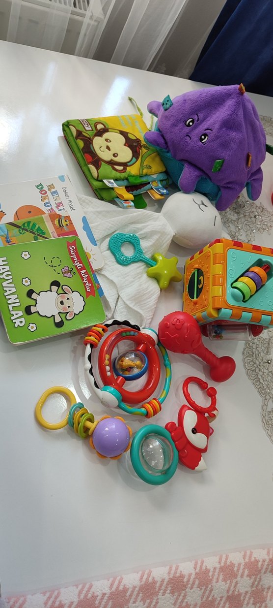 Bebekler için yumuşak ve dokulu renkli diş kaşıyıcı ve çıngırak seti. Farklı şekiller ve küçük hayvan temalı kitap içerir.