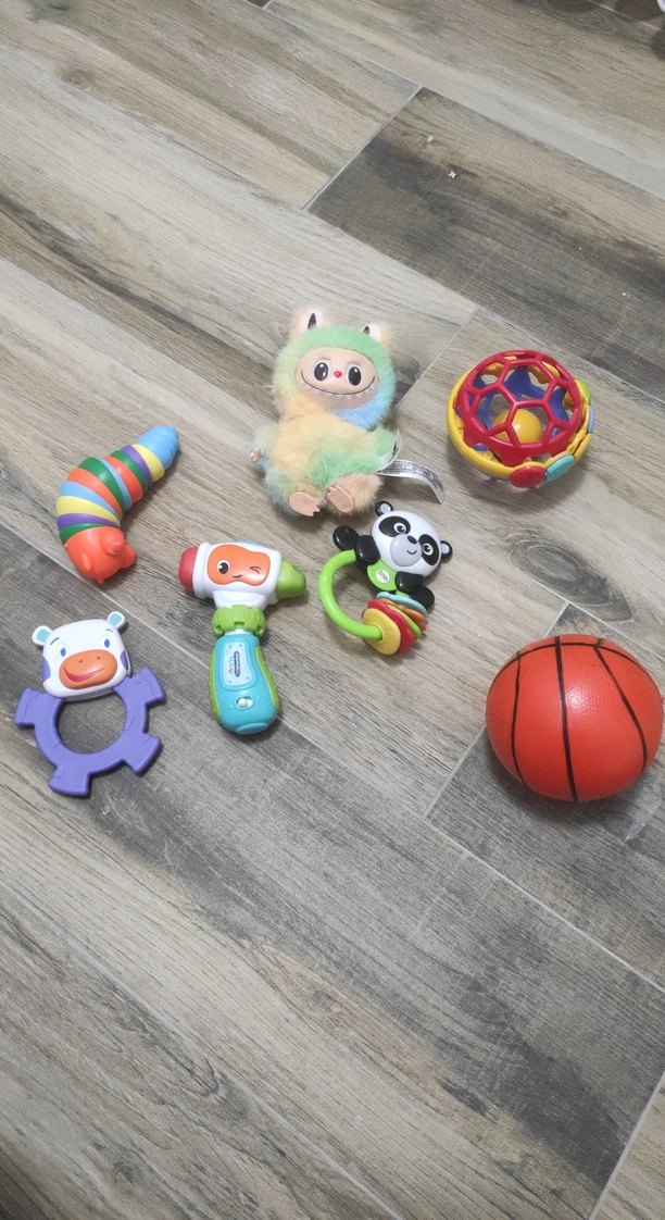 Yumuşak peluş oyuncak, basketbol topu şeklinde top ve hayvan temalı çeşitli renkli diş kaşıyıcılar ve çıngıraklardan oluşan set.