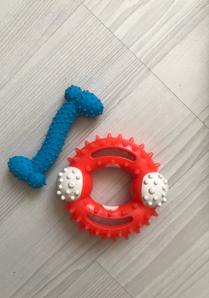 Diş etlerini rahatlatan dokulu yüzeylere sahip renkli diş kaşıyıcı ve hafif çıngırak sesli oyuncaklar.