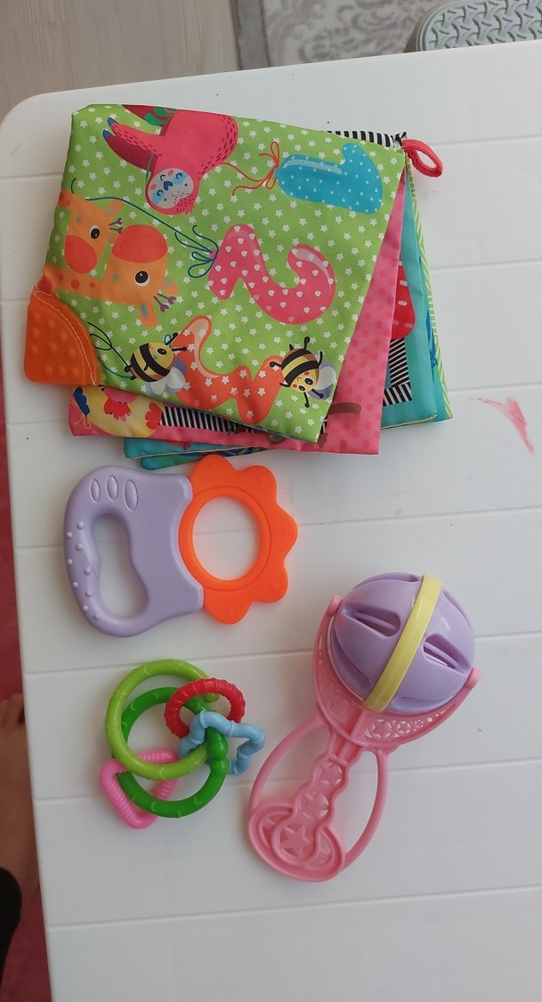 Hayvan desenli yumuşak kumaş kitap ve farklı şekil ile renklerde plastik çıngıraklardan oluşan renkli diş kaşıyıcı ve çıngırak seti.