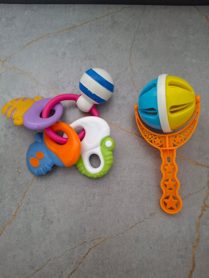 Bebekler için tasarlanmış, çeşitli şekillerde ve canlı renklerde diş kaşıyıcı ve çıngırak seti.