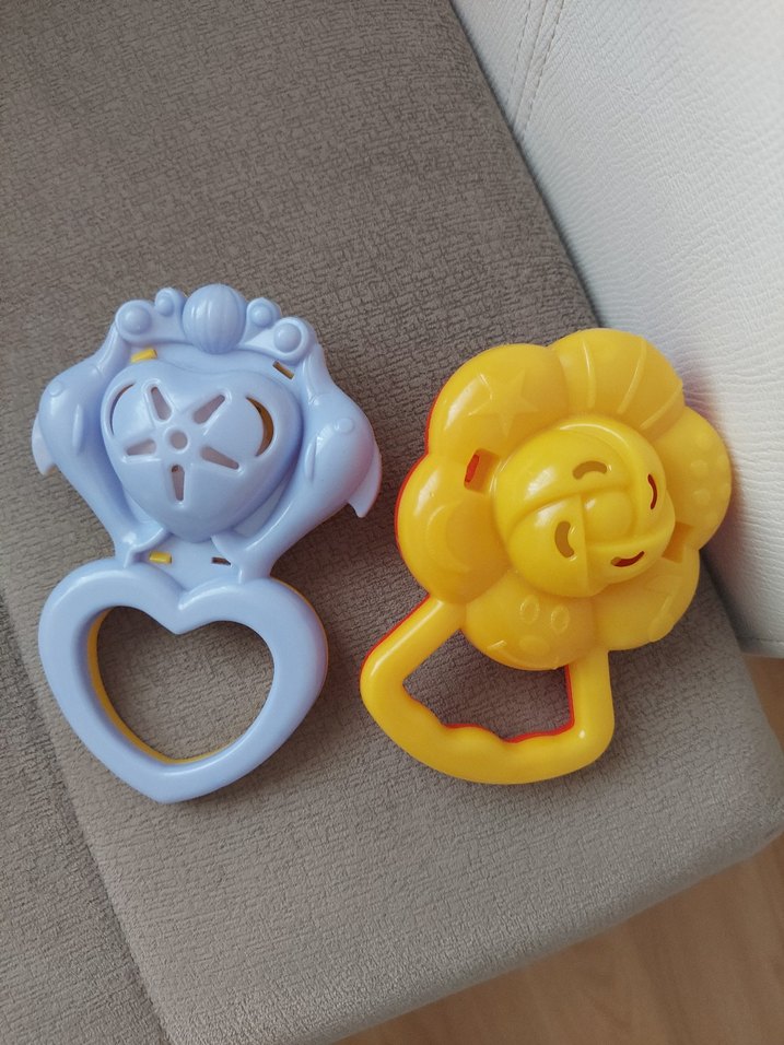Sarı aslan figürlü ve açık mavi kalp şeklinde, bebeğin tutup çiğneyebileceği renkli diş kaşıyıcı ve çıngırak seti.