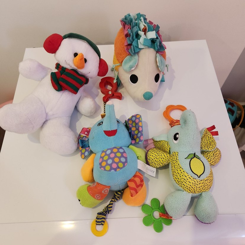Bebeklerin diş etlerini rahatlatan ve eğlendiren, yumuşak dokulu renkli hayvan figürlü diş kaşıyıcı ve çıngıraklar.